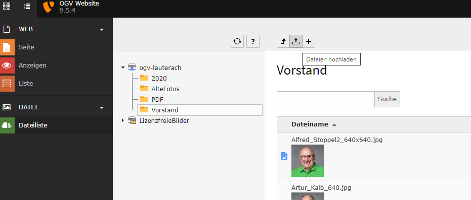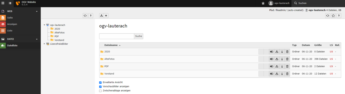 Um den Inhalt einzusehen wird der entsprechend Ordner (bzw. einer der ggf. darin enthaltenen Unterordner) aufgerufen, in vorstehender Abbildung z.B. ogv-lauterach / Vorstand. Sofern die Checkbox bei Vorschaubilder anzeigen gesetzt ist, können die Bilder über zugehörige Thumbnails (engl. für „Minibild“ bzw. „Vorschaubild“) begutachtet werden. Sollten sich sehr viele Medien in einem Ordner befinden, kann die Ladedauer reduziert werden, indem auf die Anzeige von Vorschaubildern verzichtet wird.
