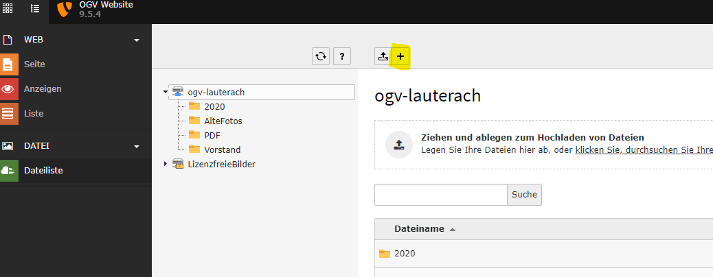 Nach Auswahl der Dateiliste wird das Dateiverzeichnis des Ortsvereins angezeigt. In der Regel sollten die Medieninhalte strukturiert in Ordner integriert werden, die eine thematische Gliederung erlauben, z.B. bilder, pdf, video, audio.