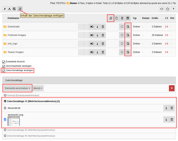 Im nachfolgenden Screenshot wurden im Modul DateilisteDateien in die Zwischenablage übertragen. Diese Dateien sollen verschoben werden. Analog verschieben Sie Objekte (wie z.B. Seiten oder Inhaltselemente) im Modul Liste.