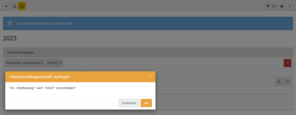 Danach wird der gewünschte Ordner in der Ordnerübersicht ausgewählt und hier mit dem Symbol Einfügen (oben) nach dem Bestätigen der Sicherheitsabfrage der ausgeschnittene Termin/Bericht eingefügt.