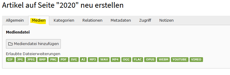Jeder Ortsverein kann eigene Bilder in sein Medienverzeichnis hochladen. Dazu wird in der Bearbeitung eines Termins/Berichts der Reiter Medien angeklickt.