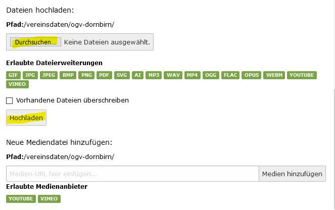 Im Bereich unterhalb der Medienliste können mit dem Button Durchsuchen Bilder vom lokalen PC ausgewählt und mit dem Button Hochladen in das Verzeichnis des Ortsvereins hochgeladen werden.