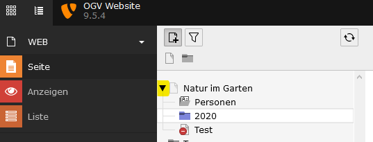 Im Menü Seite wählen, dann den Ordner des Ortsvereines und danach das Bearbeitungssymbol.